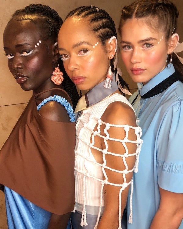 Complementing this look the face featured a signature white paint stripe under the eyes and on the ears and dots on the temples to symbolise the journeys of ancestral spirits that created land, animals, bodies of knowledge and tradition. This aim was for it to look raw and almost chalky. Accents of wet clear gloss was added to the cheeks and lips to replicate water and nature.